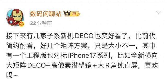 知名数码博主数码闲聊站爆料:“多家子系新机集体迎来颜值蜕变,Deco设计比前代更简约耐看,矩阵方案百花齐放。更有工程版大胆对标iPhone 17——全新横向大矩阵Deco+高像素潜望镜+大R角纯直屏,这次审美终于上道了!”